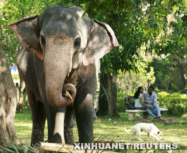 2月7日,在斯里蘭卡首都科倫坡的一個公園內(nèi),一頭大象在盡情咀嚼棕櫚樹。它的身后,一對情侶坐在長椅上享受兩人世界。新華社/路透