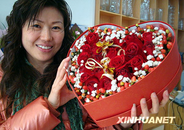 2月10日,一名顧客展示剛購(gòu)買(mǎi)的心形玫瑰禮盒。隨著情人節(jié)臨近,蘇州各花店的玫瑰花開(kāi)始走俏。