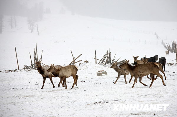 2月11日,幾只馬鹿在雪中覓食。當(dāng)日,新疆哈密北部沿天山一帶普降小到中雪,這場春雪有效緩解了巴里坤草原的旱情,對(duì)草場返青十分有利。