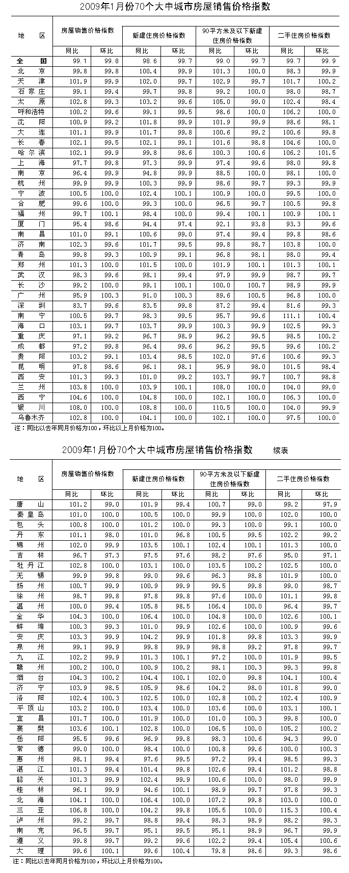 根據(jù)國(guó)家發(fā)展改革委、國(guó)家統(tǒng)計(jì)局調(diào)查顯示,1月份,全國(guó)70個(gè)大中城市房屋銷(xiāo)售價(jià)格同比下降0.9%,降幅比12月擴(kuò)大0.5個(gè)百分點(diǎn);環(huán)比下降0.2%。