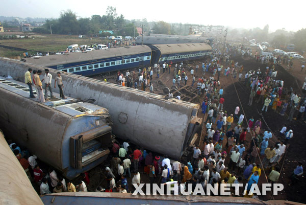 2月14日,在印度奧里薩邦首府布巴內(nèi)什瓦爾附近的杰吉浦爾,人們聚集在火車出軌事故現(xiàn)場(chǎng)。據(jù)印度亞洲通訊社當(dāng)天報(bào)道,一趟從加爾各答開往馬德拉斯的高速列車13日在杰吉浦爾發(fā)生出軌事故,目前已造成至少15人死亡,150人受傷,事故原因正在調(diào)查中。 新華社/法新