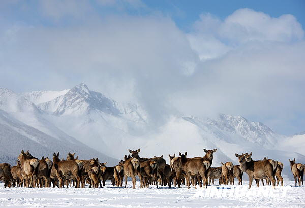 2月14日,一群馬鹿在哈密天山腳下覓食。