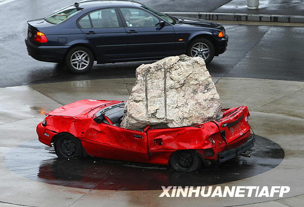 此前,這一“被大石塊砸中的汽車”雕塑在悉尼雙年展上吸引了眾多參觀者的關注。新華社/法新