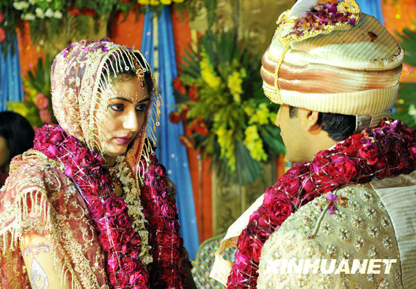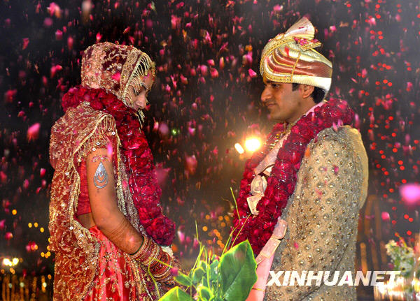 2月16日,在印度首都新德里郊外舉行的印度教婚禮儀式上,新娘深情地凝望新郎。印度青年男女的傳統(tǒng)婚禮儀式以其華麗的服飾、盛大的場面、熱情的歌舞等特色聞名。