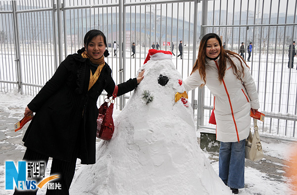 2月18日,兩位游客欣喜的在鳥巢入口處堆積的“雪人”旁合影留念。