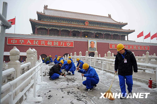 2月18日,工人在天安門金水橋上施工。