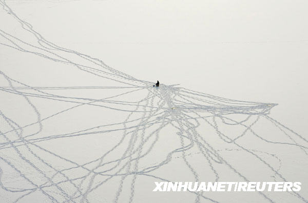 2月21日,在距白俄羅斯首都明斯克西南380公里的一個村莊附近,一名漁夫在冰雪覆蓋的湖面上釣魚。新華社/路透
