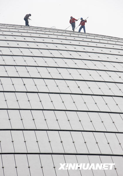 2月23日,工人在國(guó)家大劇院頂部進(jìn)行清潔工作。當(dāng)日,國(guó)家大劇院進(jìn)行例行清潔工作,清潔要持續(xù)5天左右。