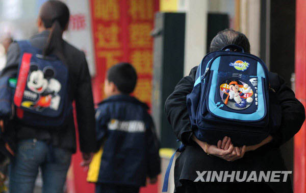 2月24日,中午時分,在廣西柳州市躍進路,接孩子放學的家長成為一道奇特的景觀,其中一位老人背著孩子的書包緩緩走在回家路上,令路人不禁感慨良多。