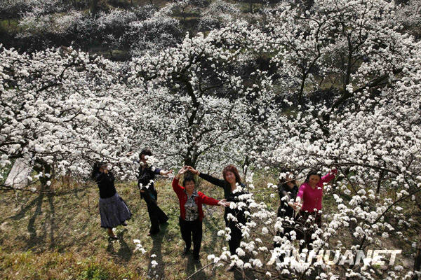 貴定縣盤江鎮(zhèn)中落海村的萬畝李樹鮮花盛開,游人在樹林間翩翩起舞(2月24日攝)。