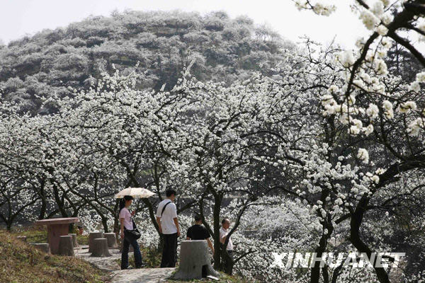 眼下,貴州省貴定縣盤江鎮(zhèn)中落海村的萬畝李樹已進(jìn)入盛花期,大片山坡宛如雪后銀裝素裹,美不勝收,吸引了眾多游人紛至沓來。