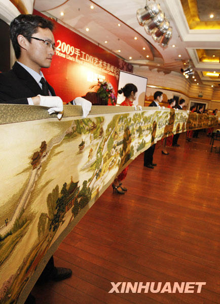 2月26日,工作人員在展示十字繡作品《清明上河圖》。當(dāng)日,一幅臨摹名畫(huà)《清明上河圖》巨幅十字繡作品在滬亮相。這幅繡品長(zhǎng)22米,由10位技師耗時(shí)近6個(gè)月制作而成,所用繡線總長(zhǎng)達(dá)116.5公里。