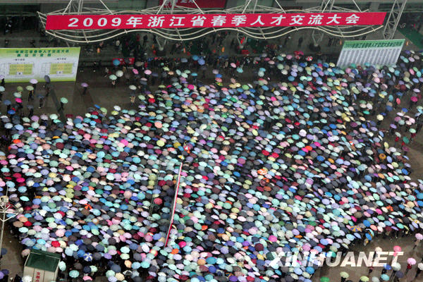 28日,求職者冒雨在杭州和平國際會展中心廣場排隊,等候入場。當日,2009年浙江省春季人才交流大會在杭州和平國際會展中心舉行,約1300家企事業(yè)單位提供了2.6萬個崗位,其中針對應屆畢業(yè)生的崗位超過1萬個,吸引了數(shù)萬名來自省內外的求職者。新華社發(fā)