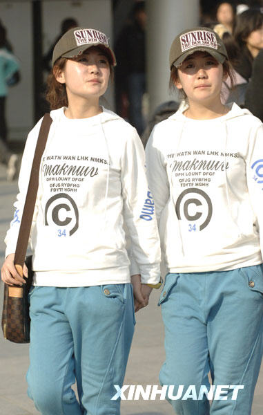 3月8日,北京一對(duì)著裝輕便的雙胞胎姐妹在逛街。當(dāng)日,北京天氣晴朗,最高氣溫14攝氏度,讓人感受到濃濃的春意。