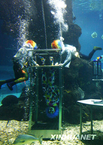3月11日,三位魔術(shù)師正在表演水下逃生。當(dāng)日,一場(chǎng)水下魔術(shù)表演亮相上海長(zhǎng)風(fēng)海洋世界,身著小丑服裝的魔術(shù)師用精湛的表演向觀眾展示了水下魔術(shù)的神奇魅力。