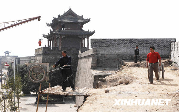 3月15日拍攝的襄陽古城墻修復(fù)施工現(xiàn)場(chǎng)。經(jīng)國(guó)家文物局批準(zhǔn),湖北襄樊市對(duì)國(guó)家重點(diǎn)文物保護(hù)單位襄陽古城墻小北門至荊州古治段的447.2米的古城墻進(jìn)行維修。維修工程主要包括對(duì)坍塌墻體和豁口處進(jìn)行恢復(fù)、內(nèi)外墻護(hù)坡加固、恢復(fù)垛堞、鋪設(shè)游路等。