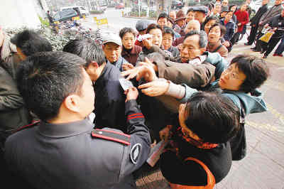 圖為3月16日,南京某銀行網(wǎng)點(diǎn)工作人員給排隊(duì)購買國債的市民發(fā)號(hào)。