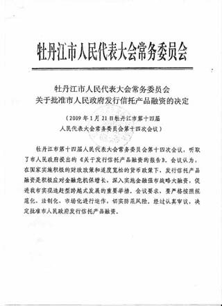 2009年1月21日,牡丹江市人大常委會(huì)全票通過,批準(zhǔn)政府發(fā)行信托產(chǎn)品融資。