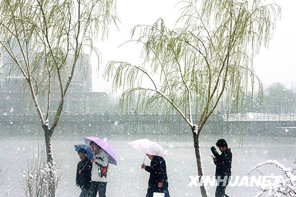 3月24日,山東濱州學(xué)院的幾名學(xué)生冒雪行走在校園里。當(dāng)日,山東部分地區(qū)迎來(lái)雨夾雪,個(gè)別地區(qū)還出現(xiàn)了中到大雪。專(zhuān)家介紹說(shuō),此次降雪有利于改善土壤墑情,但低溫也可能帶來(lái)凍害。新華社發(fā)