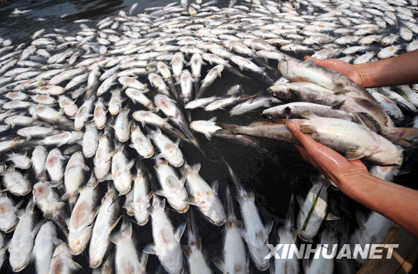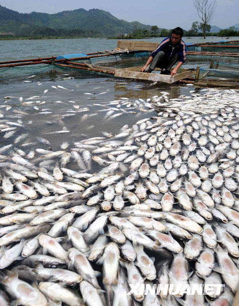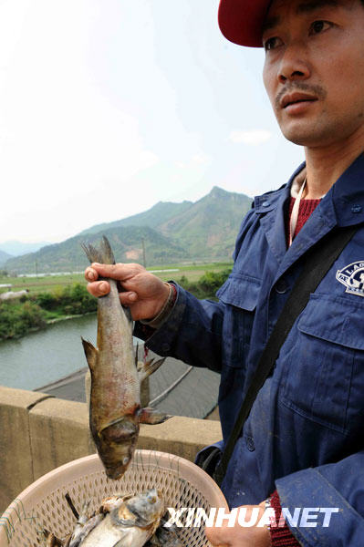 3月29日,一位農(nóng)民痛心地捧著已死的魚。新華社記者:陳瑞華 攝