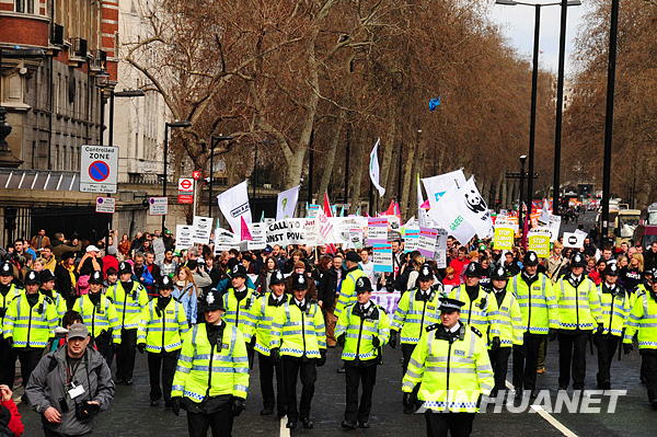 3月28日,在英國倫敦街頭,大批身穿“熒光黃”制服的警察在游行隊(duì)伍前維持秩序。新華社社記者馬建國攝