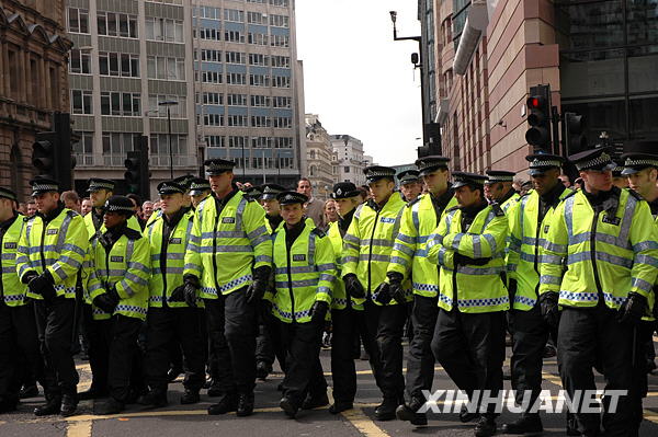 4月1日,英國倫敦街頭到處是身穿“熒光黃”制服的警察。二十國集團(tuán)金融峰會于4月2日在倫敦開幕。為了應(yīng)對峰會期間的抗議示威,大約5000名身穿“熒光黃”制服的英國警察上街執(zhí)勤。新華社社記者馬建國攝