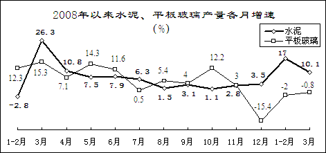 建材行業(yè)。一季度,全國水泥產(chǎn)量28049萬噸,同比增長12.9%,增速同比加快3.7個百分點(去年同期受低溫雨雪冰凍災(zāi)害影響增速較低);平板玻璃產(chǎn)量13533萬重箱,增長0.5%,減緩12.4個百分點。