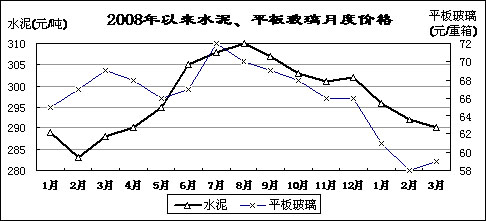 水泥、平板玻璃價(jià)格低位波動(dòng)。3月份,重點(diǎn)建材企業(yè)水泥平均出廠價(jià)為290元/噸,比2月份回落2元/噸,降至2008年4月份水平,同比上漲2元/噸;平板玻璃出廠價(jià)59元/重量箱,比2月份回升1元/重量箱,同比回落10元/重量箱。3月末,重點(diǎn)建材企業(yè)水泥庫(kù)存1226萬(wàn)噸,同比上升19.1%;平板玻璃庫(kù)存2084萬(wàn)重量箱,下降14.6%。