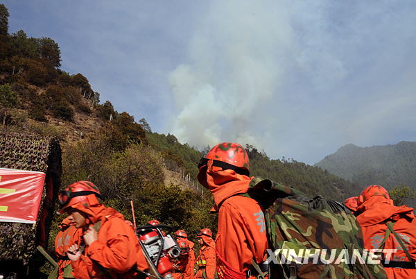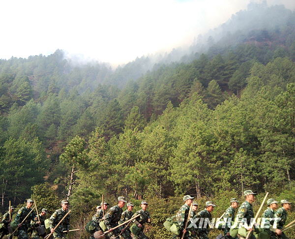 5月4日,森林武警官兵正準(zhǔn)備爬山進(jìn)行滅火。