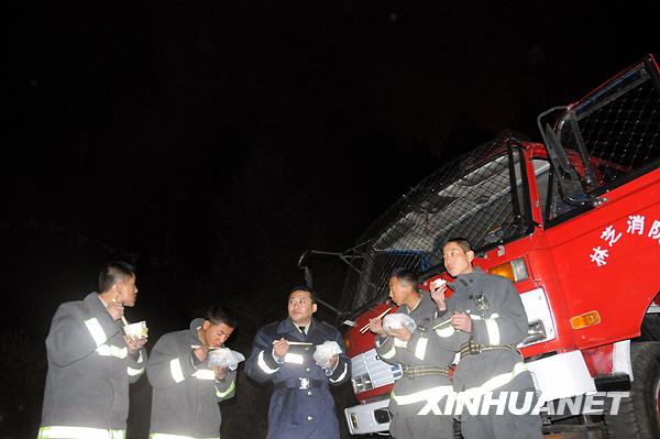 5月4日,西藏林芝地區(qū)武警消防官兵在火場(chǎng)吃飯。 |