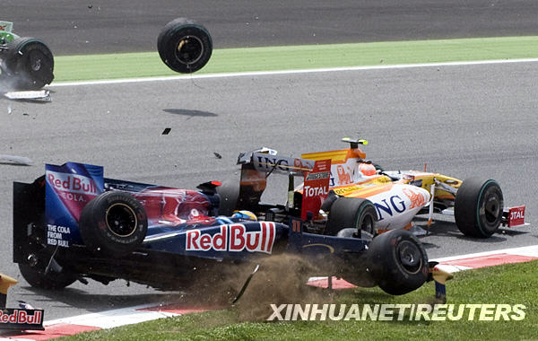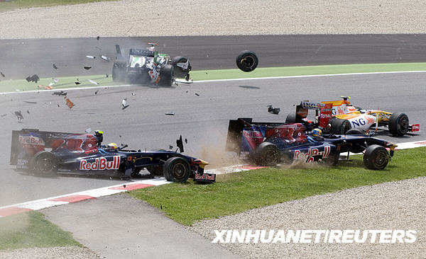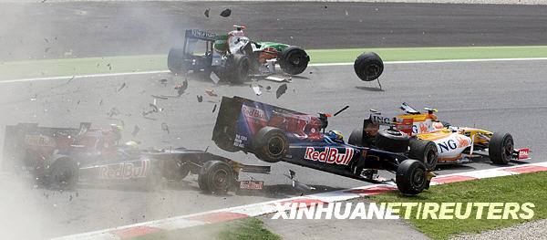 5月10日,紅牛二隊(duì)車手布爾代(前中)和隊(duì)友布埃米(前左)以及印度力量車隊(duì)車手蘇蒂爾(后)、雷諾車隊(duì)車手皮蓋駕駛的賽車發(fā)生碰撞。當(dāng)日,F(xiàn)1西班牙大獎(jiǎng)賽落幕,布朗GP車隊(duì)的英國車手巴頓奪得冠軍。新華社/路透