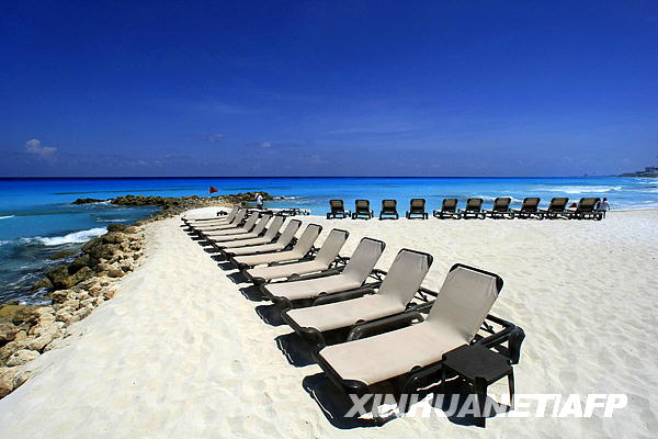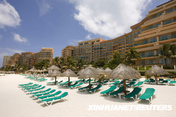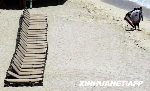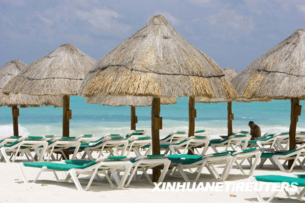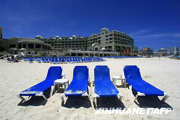 5月12日拍攝的照片顯示墨西哥旅游勝地坎昆海灘上見不到一個游客。甲型H1N1流感使墨西哥旅游業(yè)遭受重創(chuàng)。墨西哥地方官員11日說,游客銳減已迫使旅游勝地坎昆等地的25家酒店關(guān)門。墨旅游促進委員會公布最新預(yù)測稱,2009年墨西哥旅游業(yè)盈利將比2008年減少近三成。新華社/法新