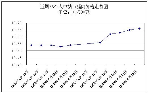 據(jù)國(guó)家發(fā)展改革委價(jià)格監(jiān)測(cè)中心監(jiān)測(cè),上周(2009.6.22-2009.6.26,下同)36個(gè)大中城市集市、超市豬肉(精瘦肉)平均零售價(jià)格每500克為10.62元,與前一周(2009.6.15-2009.6.19,下同)相比上漲0.76%。