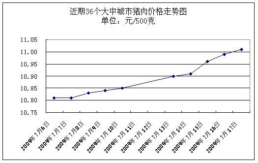 據(jù)國家發(fā)展改革委價格監(jiān)測中心監(jiān)測,上周(2009.7.13-2009.7.17,下同)36個大中城市集市、超市豬肉(精瘦肉)平均零售價格每500克為10.95元,與前一周(2009.7.6-2009.7.10,下同)相比上漲1.11%。