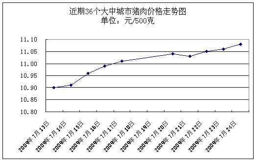 據(jù)國(guó)家發(fā)展改革委價(jià)格監(jiān)測(cè)中心監(jiān)測(cè),上周(2009.7.20-2009.7.24,下同)36個(gè)大中城市集市、超市豬肉(精瘦肉)平均零售價(jià)格每500克為11.05元,與前一周(2009.7.13-2009.7.17,下同)相比上漲0.91%。