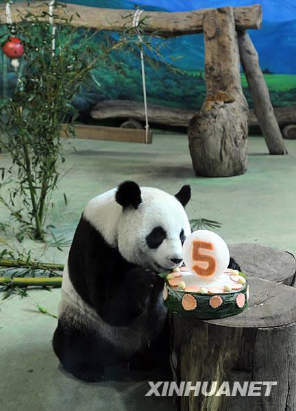 8月30日,“圓圓”(左)過生日,“團團”(右)也跟著沾光,一起分享蛋糕。