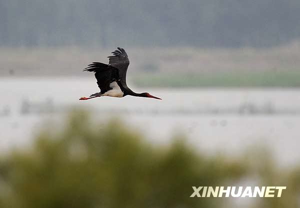 9月7日,在張掖市高臺縣境內(nèi)的黑河濕地上空,一只黑鸛振翅飛翔。