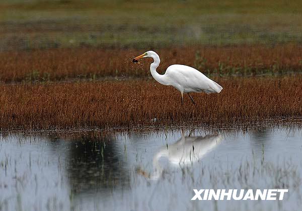 9月7日,在張掖市高臺縣境內(nèi)的黑河濕地內(nèi),一只白鷺在進(jìn)食。