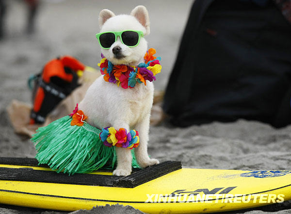 9月13日,在美國加利福尼亞州的德爾馬,一只裝扮入時(shí)的小狗等待參加沖浪比賽。當(dāng)天,這里舉辦了一場狗狗沖浪大賽,旨在為流浪動(dòng)物籌集善款并喚起人們對寵物的愛心和責(zé)任感。