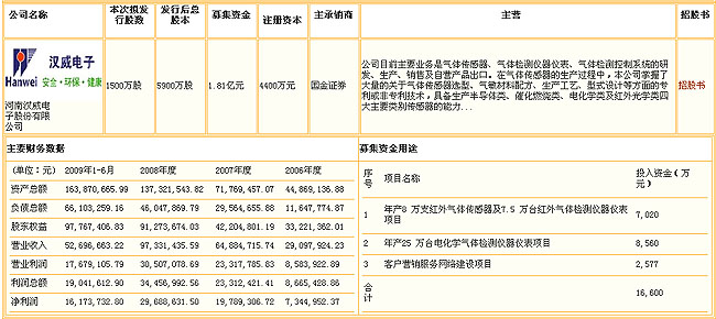 河南漢威電子股份有限公司主營(yíng)氣體傳感器、氣體檢測(cè)儀器儀表和氣體檢測(cè)控制系統(tǒng),擬發(fā)行1500萬(wàn)股,募集資金18157萬(wàn)元,發(fā)行后總股本不超過(guò)5900萬(wàn)股。該公司今年上半年實(shí)現(xiàn)凈利潤(rùn)1617.37萬(wàn)元,每股收益0.37元。 公司研究、開(kāi)發(fā)、生產(chǎn)、銷售電子傳感器;電子監(jiān)控技術(shù)開(kāi)發(fā);研究、開(kāi)發(fā)、生產(chǎn)、銷售檢測(cè)儀器及控制系統(tǒng)、機(jī)械電器設(shè)備、防爆電氣系列產(chǎn)品;提供技術(shù)轉(zhuǎn)讓、技術(shù)服務(wù)、技術(shù)咨詢;計(jì)算機(jī)軟件開(kāi)發(fā)與銷售;計(jì)算機(jī)網(wǎng)絡(luò)工程施工;防爆設(shè)備安裝工程施工(以上憑資質(zhì)證經(jīng)營(yíng));經(jīng)營(yíng)本企業(yè)自產(chǎn)產(chǎn)品的出口業(yè)務(wù)和本企業(yè)所需的機(jī)械設(shè)備、零配件、原輔材料的進(jìn)口業(yè)務(wù),但國(guó)家限定公司經(jīng)營(yíng)或禁止進(jìn)出口的商品除外。