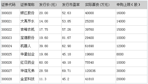 15日,包括銀江股份、大禹節(jié)水、吉峰農(nóng)機在內(nèi)的9只創(chuàng)業(yè)板新股將在網(wǎng)上發(fā)行,相比前兩批,這批公司的發(fā)行市盈率相對較高。據(jù)悉,業(yè)內(nèi)人士普遍看好華誼兄弟、紅日藥業(yè)、機器人三家企業(yè)。另外,投資者如果要全部頂格申購9家企業(yè),所需資金將高達330萬元。