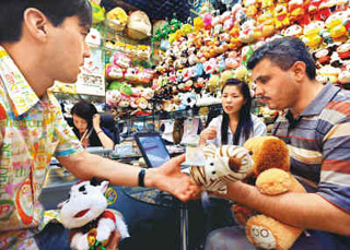 土耳其采購商在浙江義烏挑選訂購毛絨玩具。新華社記者 譚進(jìn)