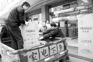 牛年大年初七,山東省平度市麻蘭鎮(zhèn)的4名村民結伴進城,走入一家海爾家電專賣店。經(jīng)過一番比較,每人挑了1臺冰箱。4戶人家各有各的眼光,不過他們做出了相同的選擇——這些冰箱的醒目位置都貼著統(tǒng)一的“家電下鄉(xiāng)”紅色標志。農(nóng)民購買這樣的家電,價格的13%由政府出,一臺價值2000元的冰箱,補貼就是