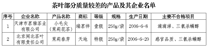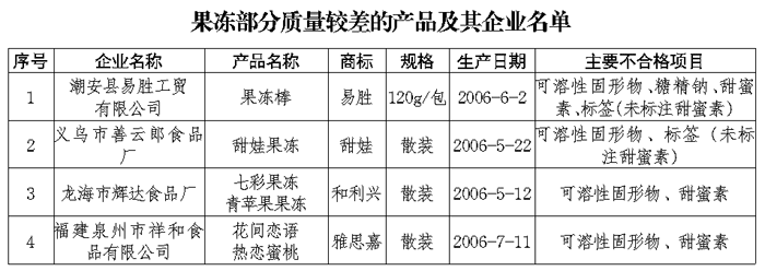 茶葉產(chǎn)品抽查中發(fā)現(xiàn)的主要質(zhì)量問題為部分產(chǎn)品衛(wèi)生指標(biāo)不合格、質(zhì)量等級不符合標(biāo)簽標(biāo)注不規(guī)范。罐頭產(chǎn)品抽查中發(fā)現(xiàn)的主要質(zhì)量問題是個別產(chǎn)品檢出二氧化硫。果凍產(chǎn)品抽查中發(fā)現(xiàn)的主要質(zhì)量問題是個別產(chǎn)品超限量超范圍使用甜味劑、部分產(chǎn)品可溶性固形物達(dá)不到標(biāo)準(zhǔn)要求以及標(biāo)簽標(biāo)注不規(guī)范。