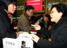 3月15日,一些技術(shù)人員(右)正在向消費者講述識別偽劣防盜安全門的常識。當(dāng)日,是國際消費者權(quán)益日,上海市消保委和上海市質(zhì)監(jiān)局聯(lián)手在全市19個區(qū)縣舉辦了專項服務(wù)咨詢和投訴受理活動,并現(xiàn)場提供商品質(zhì)量、真假檢測等便民服務(wù)。