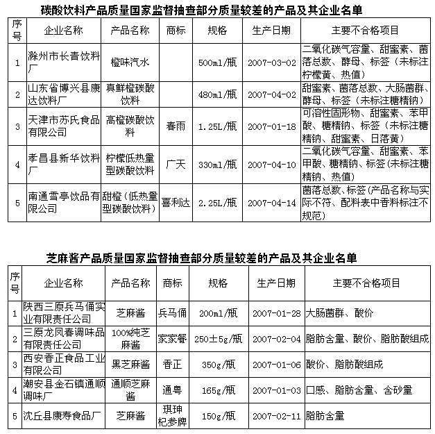 日前,國家質檢總局對黃酒、碳酸飲料、芝麻醬等產品進行了國家質量監(jiān)督抽查,抽檢合格率分別為92.3%、78.6%、和87.5%。 黃酒行業(yè)抽查中發(fā)現的主要問題有,第一,菌落總數超標。國家規(guī)定黃酒產品的菌落總數應≤50cfu/ml,抽查中有個別產品菌落總數為77cfu/ml;第二,個別產品非糖固形物不合格,主要是因為在原酒中摻水;第三,個別產品氨基酸態(tài)氮及總酸不合格,這會影響黃酒的口感。 碳酸飲料行業(yè)抽查中發(fā)現的主要質量問題是:部分產品微生物指標、甜味劑、防腐劑含量超標;部分產品二氧化碳氣容量不合格等。 芝麻醬產品抽查中發(fā)現的主要質量問題是:個別產品大腸菌群不合格。大腸菌群是直接涉及人體健康的重要衛(wèi)生指標。國家標準規(guī)定芝麻醬產品的大腸菌群應≤90個/100g。抽查中有個別產品大腸菌群為230個/100g。個別產品脂肪酸組成、脂肪含量不合格。