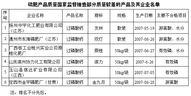 日前,國(guó)家質(zhì)檢總局對(duì)磷肥產(chǎn)品質(zhì)量進(jìn)行了國(guó)家監(jiān)督抽查,共抽查了河北、甘肅、福建、陜西、廣西、江蘇、湖北、四川、貴州、云南、山東、河南、安徽、江西、湖南等15個(gè)省、自治區(qū)143家企業(yè)生產(chǎn)的144種產(chǎn)品(不涉及出口產(chǎn)品),產(chǎn)品實(shí)物質(zhì)量合格率為87.5%。 過磷酸鈣和鈣鎂磷肥是我國(guó)主要的低濃度磷肥品種,可作為基肥、種肥和追肥使用。此次抽查的128種過磷酸鈣產(chǎn)品,產(chǎn)品實(shí)物質(zhì)量合格率為86.7%;抽查了16種鈣鎂磷肥產(chǎn)品,產(chǎn)品實(shí)物質(zhì)量合格率為93.8%。 此次抽查中發(fā)現(xiàn)的主要質(zhì)量問題有,首先,個(gè)別產(chǎn)品游離酸不合格。強(qiáng)制性國(guó)家標(biāo)準(zhǔn)規(guī)定,過磷酸鈣的游離酸含量為小于等于5.5%。抽查中有個(gè)別過磷酸鈣產(chǎn)品游離酸不合格,主要原因是生產(chǎn)過程中硫酸的添加量控制不嚴(yán)或產(chǎn)品未經(jīng)完全熟化導(dǎo)致。游離酸超標(biāo)的產(chǎn)品可以傷害植物種子和幼苗。 第二,少數(shù)產(chǎn)品水分不合格。強(qiáng)制性國(guó)家標(biāo)準(zhǔn)規(guī)定,粉狀過磷酸鈣合格產(chǎn)品的水分含量為小于等于15.0%。抽查中有一種產(chǎn)品水分含量為23.1%。水分超標(biāo)的產(chǎn)品易結(jié)塊,施肥時(shí)不容易被作物吸收。 針對(duì)抽查中發(fā)現(xiàn)的主要質(zhì)量問題,國(guó)家質(zhì)檢總局已責(zé)成各地質(zhì)量技術(shù)監(jiān)督部門嚴(yán)格按照產(chǎn)品質(zhì)量法等有關(guān)法律法規(guī)的規(guī)定,對(duì)抽查中產(chǎn)品質(zhì)量不合格的企業(yè)依法進(jìn)行處理,督促企業(yè)限期整改;對(duì)抽查中質(zhì)量較好的產(chǎn)品及其生產(chǎn)企業(yè),加大宣傳力度。國(guó)家質(zhì)檢總局將繼續(xù)對(duì)磷肥產(chǎn)品質(zhì)量進(jìn)行跟蹤抽查,促進(jìn)磷肥行業(yè)整體質(zhì)量水平的提高。