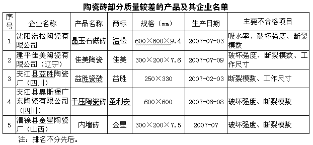為維護廣大消費者的合法權(quán)益,促進陶瓷磚行業(yè)健康發(fā)展,國家質(zhì)檢總局組織對陶瓷磚產(chǎn)品質(zhì)量進行了國家監(jiān)督抽查。共抽查了河北、山西、遼寧、上海、江蘇、浙江、廣東、山東、四川、福建、河南等11個省、直轄市136家企業(yè)生產(chǎn)的136種產(chǎn)品(不涉及出口產(chǎn)品),產(chǎn)品實物質(zhì)量合格率為89.7%。 此次抽查依據(jù)推薦性國家標準GB/T4100-2006《陶瓷磚》和強制性國家標準GB6566-2001《建筑材料放射性核素限量》規(guī)定的要求,對陶瓷磚產(chǎn)品的尺寸、破壞強度、斷裂模數(shù)、吸水率、無釉地磚耐磨性、光澤度、有釉磚抗釉裂性、放射性及產(chǎn)品標志等九個項目進行了檢驗。 陶瓷磚按用途分為外墻磚、內(nèi)墻磚、地磚等。按釉面狀況分為有釉磚和無釉磚。特點是強度高,耐磨,壽命長,耐水耐腐蝕,廣泛用于裝飾與保護建筑物、構(gòu)筑物的墻面和地面。 抽查結(jié)果表明,一是市場占有率較高的大型企業(yè)的產(chǎn)品實物質(zhì)量合格率為100%;二是所檢陶瓷磚產(chǎn)品放射性核素含量全部合格。 抽查中發(fā)現(xiàn)的主要質(zhì)量問題: 1、個別產(chǎn)品破壞強度與斷裂模數(shù)不合格。破壞強度、斷裂模數(shù)是陶瓷磚產(chǎn)品的重要性能指標。抽查中有個別產(chǎn)品破壞強度與斷裂模數(shù)低,達不到國家標準規(guī)定的要求。破壞強度與斷裂模數(shù)不合格的產(chǎn)品在使用中容易開裂、破碎。 2、個別產(chǎn)品吸水率不合格。吸水率是陶瓷制品中的氣孔吸附水的多少占制品的百分比。吸水率低,一般情況下陶瓷磚的強度相應較高,耐磨性和拋光磚的光澤度指標性能較好。抽查中有個別產(chǎn)品吸水率不合格,超過國家標準規(guī)定的要求。主要是陶瓷磚燒制溫度低,時間短,導致坯體空隙加大,在使用中容易產(chǎn)生裂紋或剝落。 另外,佛山市圣陶坊陶瓷有限公司、佛山市輝鵬陶瓷有限公司在國家監(jiān)督抽查中拒絕抽查,其產(chǎn)品質(zhì)量按不合格論處。