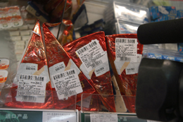 浙江省工商部門4月16日在例行食品質(zhì)量抽檢中發(fā)現(xiàn)杭州、寧波的家樂福超市銷售過期食品。圖為被工商人員當(dāng)場查扣的過期家樂福牌奶酪。保質(zhì)期顯示為2008年4月14日。