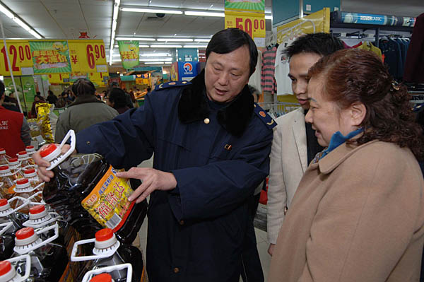 3月3日,重慶市工商局沙坪壩區(qū)分局的一名工商干部正在一個(gè)社區(qū)超市向消費(fèi)者宣傳合格食用油的辨別方法和購(gòu)買到偽劣食品的維權(quán)知識(shí)。 3月3日,為迎接“3·15”國(guó)際消費(fèi)者權(quán)益日的到來,重慶市工商局沙坪壩區(qū)分局組織轄區(qū)內(nèi)的各個(gè)工商所深入到農(nóng)貿(mào)市場(chǎng)、超市、社區(qū)就國(guó)家新推出的《食品安全法》、辨別偽劣食品等貼近百姓生活的食品安全消費(fèi)者維權(quán)知識(shí)針對(duì)經(jīng)營(yíng)戶、普通群眾進(jìn)行了廣泛宣傳,并進(jìn)一步加大了對(duì)流通領(lǐng)域出現(xiàn)的偽劣食品經(jīng)營(yíng)者、加工企業(yè)打擊力度。據(jù)了解,此項(xiàng)活動(dòng)受到了當(dāng)?shù)鼐用窈秃戏ㄊ称方?jīng)營(yíng)戶的一致歡迎。 | |